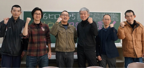 8・6広島暴処法弾圧をうち破り奪還された5同志が、弁護人を介さない接触を禁止する不当な保釈許可条件の制約を受ける中で、奪還後初めて一堂に会し、1月10日から始まる公判闘争の勝利と暴処法弾圧完全粉砕に向けて決意と団結をうち固めた。左から髙田暁典さん、冨山小太郎さん、西納岳史さん、弁護団の森川文人さん、古郡陸さん、松木誉明さん(12月23日 東京都内)