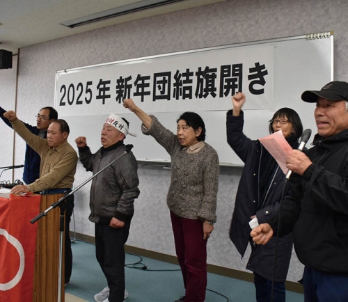 午後から芝山町飯櫃(いびつ)の福祉センター「やすらぎの里」で新年団結旗開きを開催した。最初に伊藤信晴さんが主催者あいさつに立ち、米トランプ次期大統領の相次ぐ暴言を「まるでギャング」と非難し、石破政権がトランプと共に中国侵略戦争に突進していることを指摘し、反戦闘争への全力決起を訴えた。