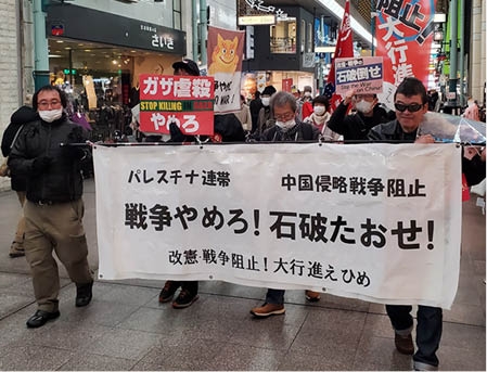 リレートークでは、「米軍と共に中国侵略戦争に突き進む石破を倒そう」「自治体労働者は住民を戦争に動員させる役割を担わされる。そうならないように戦争阻止の行動を起こそう」「松山でデモに参加するのは初めて。一緒に闘いましょう」など、参加者が次々とアピール。