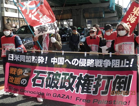 その後、強風が吹く中、「侵略粉砕・トランプ打倒」「安保粉砕・石破打倒」「フリーフリーガザ」のコールで米領事館を直撃するデモに出発、名古屋駅前で多くの労働者市民と合流しました。