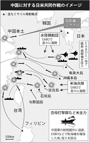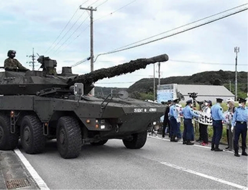 沖縄本島、石垣島、宮古島、奄美大島に陸上自衛隊のミサイル部隊を配備し、ミサイルの射程距離を伸ばし、米軍から大量の巡航ミサイルを購入して中国本土への攻撃手段の保有を図っている。与那国島にもミサイル部隊の配備が狙われ、3月24日には宮古島に電子作戦隊が発足した。宮古島などの現地住民の間でも「『力による現状変更』を進めているのは中国ではなく、米日のほうではないか」と抗議の声が噴出している。