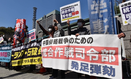 日本帝国主義の中国侵略戦争の最高司令部である自衛隊統合作戦司令部が3月24日に発足するのを前に、改憲・戦争阻止!大行進東京の呼びかけで3月21日、防衛省抗議行動が闘われた。東京・市谷の防衛省正門前に、全学連をはじめとする大行進東京の70人が結集した。司会を務めた全学連の西村凌風書記次長は、統合作戦司令部が、米軍と一体化して中国侵略戦争を実際に発動するための作戦司令部に他ならないことを怒りを込めて弾劾し、「沖縄を戦場にするな! 沖縄の人々と怒りを一つにして闘おう」「イスラエルによるパレスチナ人民大虐殺を許すな!」と呼びかけた。