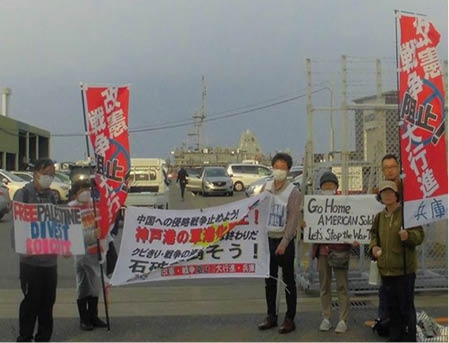 3月24日、米海軍の艦艇が50年ぶりに神戸港に入港しました(掃海艦ウォーリア)。私たちは緊急抗議闘争をしました。摩耶埠頭(まやふとう)で「米日の中国侵略戦争阻止」「米軍艦は出て行け」と声を上げ、三宮で街頭宣伝をしました。多くの若者が拍手し拳を挙げ一緒にボードを掲げてくれました。