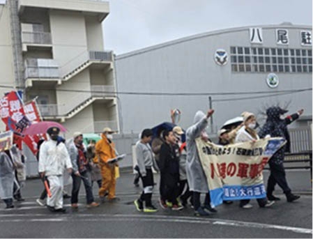 八尾市内で3月16日、八尾北医療センター労組、全国水平同盟西郡支部を始め地域住民や関西各地から集まった約40人で「八尾空港を戦争に使わせない反戦集会&デモ」を行いました。