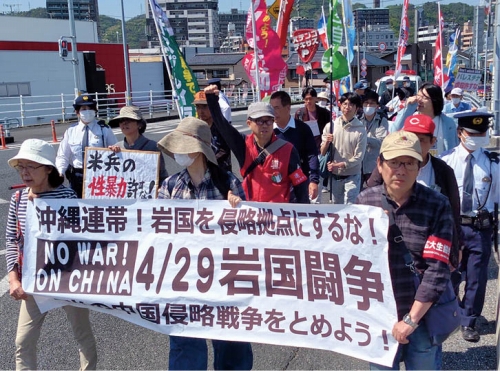 8・6ヒロシマ大行動実行委員会は29日、米軍岩国基地撤去を訴え、岩国駅前での街宣・集会と岩国基地正門へのデモを行った。