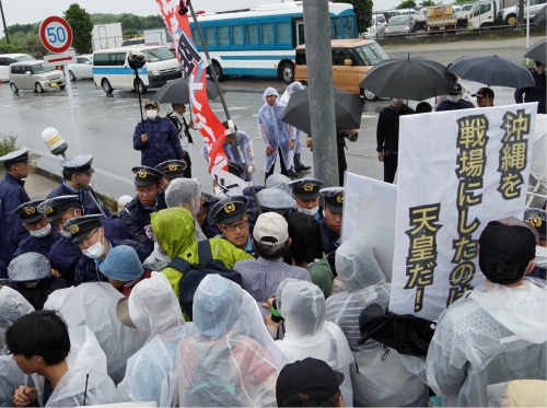 天皇の訪沖を徹底弾劾 平和祈念公園前で激突 再び沖縄を戦場にするな