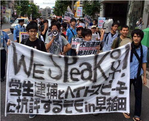 7月6日、早稲田でのカウンターデモで不当逮捕されたA君への弾圧も学生運動つぶしであり、排外主義者が国家権力と一体で仕掛けた学生運動破壊の弾圧です。絶対に許すことはできません。しかし、7月21日には、「WE SPEAK OUT!! 学生逮捕とヘイトスピーチに抗議するデモ IN早稲田〜高田馬場」が打ち抜かれました。さらなる運動に向け、現地行動隊も全力で闘いたいと思います。