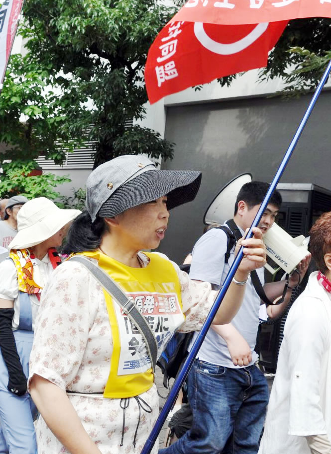 反対同盟の宮本麻子さんは、午後の8・6ヒロシマ大行動大集会に参加し、反対同盟旗を掲げて福屋を包囲して平和公園まで行進するデモ行進をやりぬいた。集会の基調報告で谷口恭子事務局長は「8・6と労働組合運動は一つの闘い。闘う労働組合を作ることが戦争を阻止する道だ」と強調した。動労千葉の田中康宏委員長は、「貪欲な資本家と政治家の戦争を阻止し、資本家を打ち倒そう」と呼びかけた。