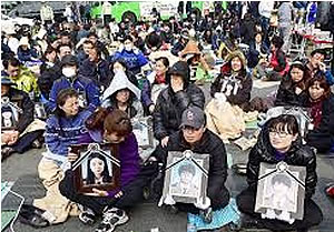 (写真 ソウル市内の大統領府近くに座り込んで抗議するセウォル号犠牲者の家族ら【5月9日】)
