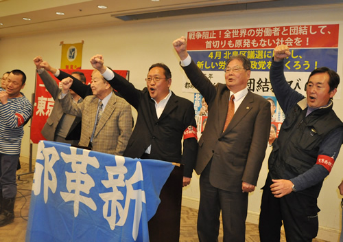 旗開きは都革新の長谷川英憲代表が司会を務め、東京西部ユニオンの副委員長で元杉並区議の北島邦彦さんが「地域では『安倍政治をどうにかしてくれ』『なんで安倍が選挙で勝つんだ』という怒りの声が溢れている。統一地方選挙はこの声を形にして安倍を倒す決戦です。絶対に当選をかちとりましょう!」と決意表明した挨拶した。