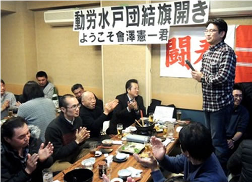 動労水戸は旗開きに先立って第33回の定期大会を開いた。大会は、昨年末に水郡線営業所主任運転士の會澤憲一さんが新たに加入したことを受けた勝利感に満ちたものとなった。その勝利を受け、旗開きは會澤さんの歓迎会を兼ねたものとして開かれた。