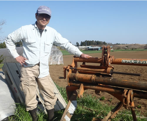 (写真 ゴボウ掘り機の脇に立つ萩原富夫さん )