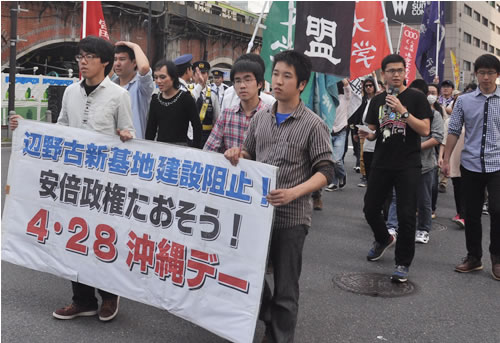 全学連は、4月28日、法大―新橋―国会前で沖縄デー闘争を闘いました。辺野古基地建設を進める安倍政権への怒りは、沖縄全島ゼネスト情勢として発展しています。
