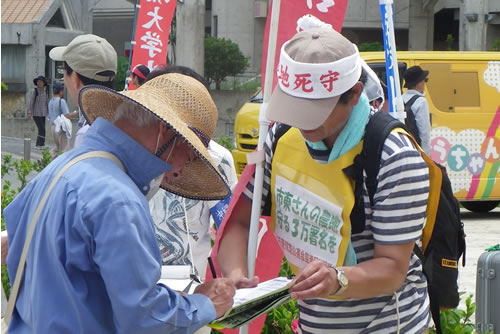 17日は、那覇のセルラースタジアムで行われた県民大会に参加した。午前10時30分に到着して、関西や東海から来た人びとの応援も得て、市東さんの署名運動を展開した。今焦点になっている農地取り上げについて話すと「沖縄とまったく同じだ」と口々に語り協力してくれる。
