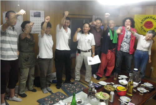市東さん宅に戻り、午後4時から交流会に臨んだ。動労水戸の木村郁夫書記長が司会。同池田学執行委員、小竹運輸労組の野澤英人副委員長、植田和実書記長そして、産直野菜の消費者、牛久入国管理事務所での強制収容者支援の闘いをしている女性、星野文昭さんをとりもどす会・茨城の男性がそれぞれ感想を語った。「50年、国と対決して闘いぬく三里塚のすごさをあらためて実感した」「毎週のように労働者が現地調査に来るような運動を」などの感想が語られた。