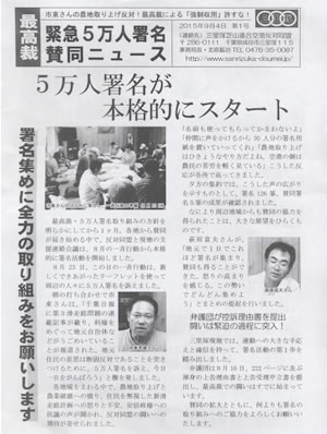 9月4日、反対同盟から「最高裁 緊急5万人署名賛同ニュース」の第1号が発行された(写真)。反対同盟は市東さん農地法裁判の最高裁決戦を闘うにあたり、新たに賛同人を広く募る闘いを開始した。その趣旨は、自分が署名をするだけでなく、集める立場に立って、市東さんの農地を守る闘いに関わってほしいとの要請だ。
