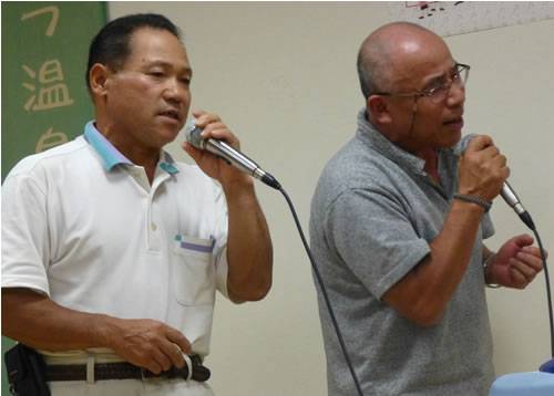 (写真 反対同盟のカラオケ大会で太郎良陽一さん【右】とデュエットする市東さん【8月30日】)