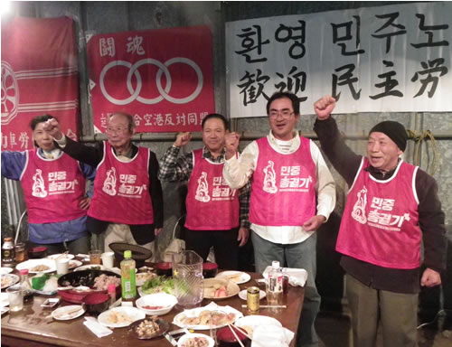最初に反対同盟の萩原富夫さんの音頭で乾杯。動労千葉の田中康宏委員長があいさつした。「反対同盟との連帯を貫き、ジェット燃料貨車輸送阻止闘争を闘い、動労本部から独立した。その力で分割・民営化攻撃と闘い、民主労総の同志たちとも出会えた」と、三里塚労農連帯の意義を語った。