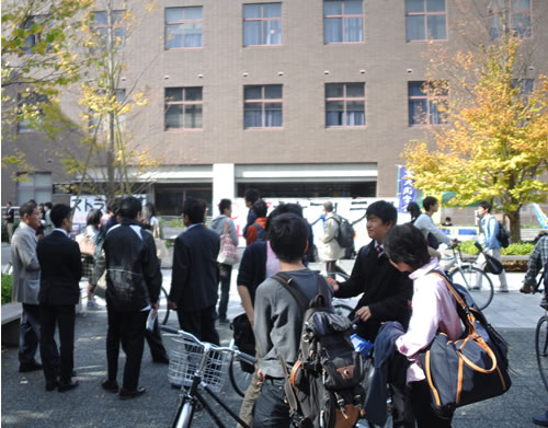 当日の朝、キャンパスに来た学生や教職員は、封鎖された1共と対面して、私たちが言う「ストライキ」とは何なのかを理解し、ある人は困った顔をし、多くの人が笑顔を向け、隣の人と話し、1共正面での同学会と全国学生の訴えを固唾(かたず)をのんで見守り、聞き入ります。同学会との討論も各所で始まり、キャンパスは昨日までの「学費・就活・奨学金」による支配から解き放たれて討論の渦に叩き込まれました。