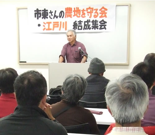 12月6日、東京江戸川区内において開かれた「市東さんの農地を守る会・江戸川」結成集会は、30人の参加で成功した。「食と安心のネットワーク江戸川産直の会」が、日頃の野菜配送や消費者との交流を通して野菜会員や青空市の購入者に呼びかけたものだ。集会には、江戸川の消費者や労働者が集うとともに、全国農民会議共同代表の小川浩さん、反対同盟の伊藤信晴さん、三里塚現闘・行動隊も参加した。