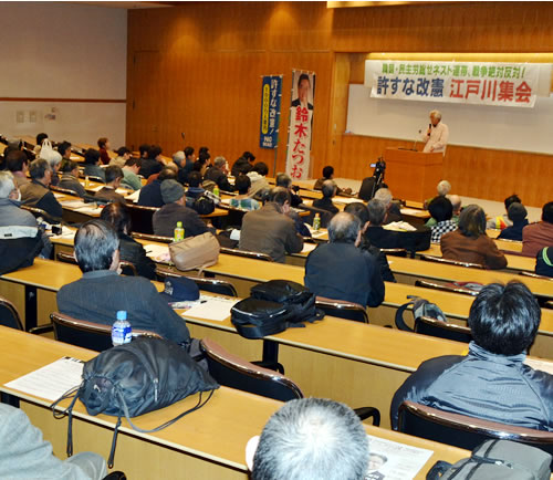 ●東京江戸川区総合文化センターで開かれた「許すな改憲 東京・江戸川集会」に反対同盟、三里塚現闘、全学連行動隊が参加した。(6日=写真)