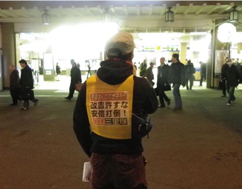 ●支援連は京成成田駅前で、第3滑走路と暫定B滑走路の1000㍍北延伸計画を弾劾する宣伝を行った。(16日=写真)