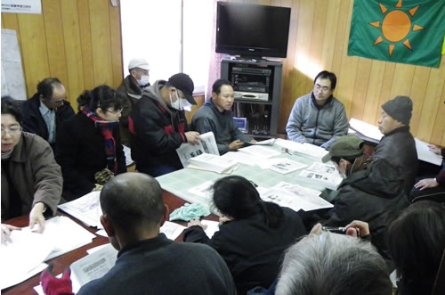 また今回、第3滑走路の予定地を示すカラーコピー地図をそれぞれが持参したこともあって、「説明がしやすかった」との報告があった。いくつかの部落で第3滑走路にむけた町の説明が予定されていることが報告された。『反対同盟ニュース』第29号は、成田市久住地区でB滑走路の延長に怒る住民の動きが始まったニュースを掲載した。第3滑走路計画を阻止する闘いの地熱はいよいよ高まっている。大きな成果を共有し、次回行動日を3月13日と確認して行動を終了した。
