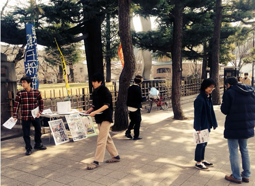 (写真 京都では連日弾圧に対する情宣活動が各所で展開されている【3月5日 平安神宮前】)
