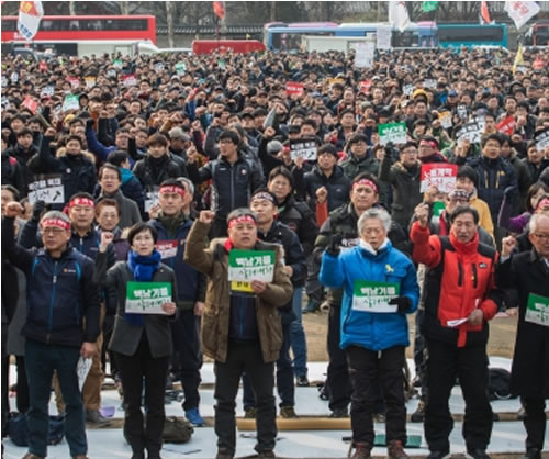 2月27日、ソウルで、パククネ政権打倒へ向けた第4次民衆総決起大会と汎国民大会が開かれた。民主労総(全国民主労働組合総連盟)を始めとする労働者、農民、学生、市民・社会団体など2万人が、ソウル市庁前広場に集まった。