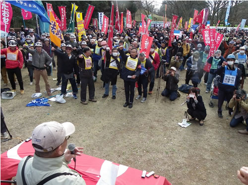 集会の最後、伊藤信晴事務局員が反対同盟からの提起と集会宣言を行った。伊藤さんは、あらためて5万人署名を全力で取り組くむよう提起した。第2部の司会である太郎良陽一事務局員でガンバロウ三唱後、反対同盟を先頭にニュータウン市街地のど真ん中を縦貫する2・3キロのデモにうって出た。成田市民は辻々や交差点でデモに注目し、空港・航空労働者との合流を勝ちとった。