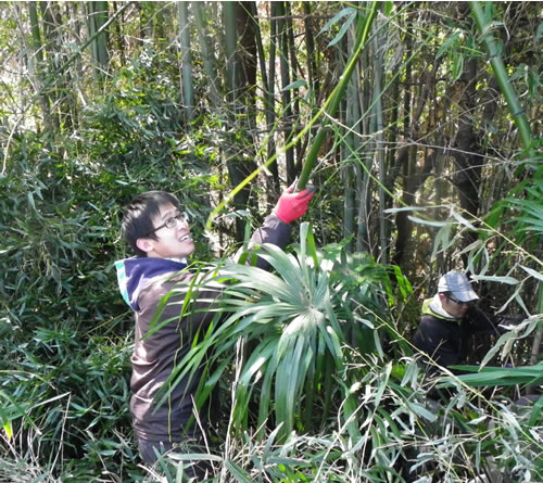 作業自体は農作業用ののこぎりで竹をひたすら刈り取るという単純なもの。しかし竹の固さに加え、空が見えないほど密集して生育する竹を刈り取ることは体が悲鳴を上げるほど過酷なものだった。