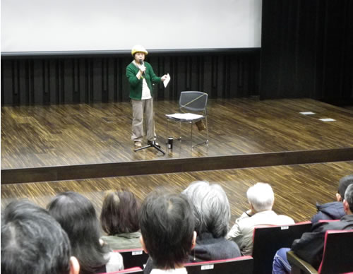2回の上映の間に反原発福島行動16実行委の椎名千恵子さんが訴えを行った(写真)。椎名さんは、「A2―B―C」について、ふくしま共同診療所が取材されていることを理由に、国の弾圧に屈服した配給会社から配給停止の仕打ちを受けたこと。しかし、それにも負けない配給会社が現れ、上映にこぎつけていることを紹介し、安倍政権による帰還強制政策、原発再稼働、原発輸出の暴挙を、抑えた口調の中にも激しい怒りを込めて弾劾し、会場の共感を集めた。