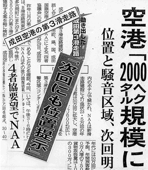 すでに、昨年11月の第2回会合で、第3滑走路はB’滑走路南東側の芝山、多古両町にまたがる3500㍍案を軸に検討を進めることなどを確認していたが、今回はその調査結果と称するものだ。そのためには、「空港の敷地面積は現在より600㌶広い2千㌶規模が必要、20年ごろには用地取得」(NAAの長田太専務)と規模・スケジュールを具体的に踏み込んだ点が決定的だ。
