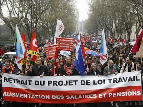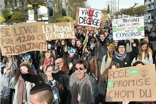 その狙いは、「競争力の強化、雇用の創出」の名による労働時間・労働条件・賃金・職場での権利などへの全面的攻撃、とりわけ非正規職の拡大にある。そして一連の改変を、労組との全国的・産業別の労働協約ではなく、企業・会社・経営レベルでの協定、就業規則の改定でやれるように労働法制を改悪し、就業規則を労働協約に優先させることにある。これは、労働組合の解体攻撃だ。 オランド社会党政権が、12年にサルコジ保守党政権に代わって登場して以来進めてきた新自由主義攻撃の上に、今回の労働法制改悪が体制内労組の存在すらも形骸化する攻撃であることから、労組間の共闘団体がつくられ、学生団体も加わって反対運動を開始した。今回の労働法制改悪は、大学生と高校生を直撃している。フランスはEU内でドイツに次ぐ「大国」だが、大恐慌で経済成長率が落ち込み(成長率は15年10~12月前期比で0・3%増)、失業率が10%を超え、とりわけ青年層(18~24歳)では24%に及んでいる。非正規職の拡大とともに貧困が広がり、大学生の大半が低賃金・無権利の職場で働いている。