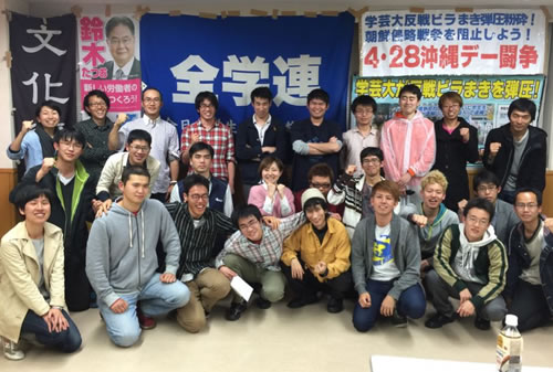 しかし、この国家権力と体制内勢力が一体となった弾圧は跳ね返されました。「戦争反対」「安倍政権打倒」は今や圧倒的に多くの人びとの欲求だからです。京大、学芸大、そして街頭にこの事実を知らせ、敵の本性を暴く中で、敵を逆に包囲し追いつめる闘いを展開することができることを示しました。