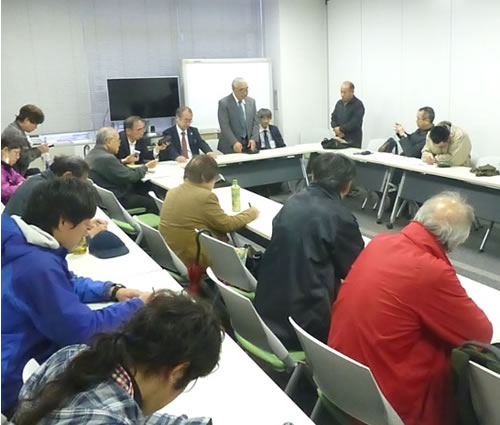 (写真 弁論終了後、報告会を行った【4月28日 弁護士会館】)