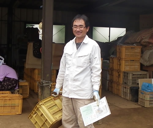 (写真 出荷作業の合間に写真に収まる萩原富夫さん【6月7日 成田市東峰】)