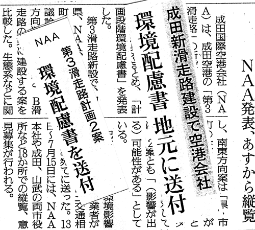 (写真 第3滑走路の推進手続きである「環境配慮書」の送付を報じる新聞各紙【6月12日付け】)