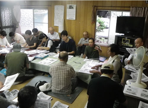 午後6時、市東さん宅離れに再集合して、成果を確認し合った。支援連各メンバーからは「もう一本の滑走路など絶対に許せない」「反対同盟ニュースで情報を得ている」「東京羽田空港をめぐる都心飛行コース反対の集会を聞いた」などの住民の声が報告されるとともに、「有志の会」が出した新しいパンフは「まったく配られていない」などの状況が話された。伊藤さんがこの日の大きな成果を確認してまとめ、次回の一斉行動を10月16日に取り組むことを確認して、一日の行動を終了した。