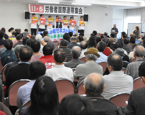 在日の闘う労働者・労働団体からは、ウガンダ民主化活動家、広島連帯ユニオン、関西合同労組阪神支部の仲間が発言に立った。被曝労働拒否を闘う動労水戸の石井真一委員長は「貧困か被曝か」を強制する常磐線沿線開通に対しストで闘う決意を述べた。「職場から労働法制改悪を許さない大運動を!」の訴えをユニオン習志野委員長の菊池晴知さん、奈良市従業員組合教育支部長の松本久由さんが行った。全日建近畿地本書記長の西山直洋さんがまとめを行い、11月国際共同行動の幕が切って落とされた。