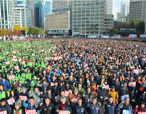 11月12日、歴史的なパククネ打倒の闘いがかちとられた。この日ソウルで開かれた民衆総決起大会とデモには、民主労総を先頭に、100万人を超える労働者、農民、学生をはじめあらゆる階層の人民が結集した。動労千葉訪韓団約はソウル地域本部の隊列に加わってともに闘った。反対同盟の萩原富夫さんも参加し先頭で闘った。 「パククネ退陣」「セヌリ党(与党)解体」「パククネを拘束しろ!」。12日夕刻、民衆総決起大会をかちとった労働者人民の巨大な隊列が続々とデモに出発した。