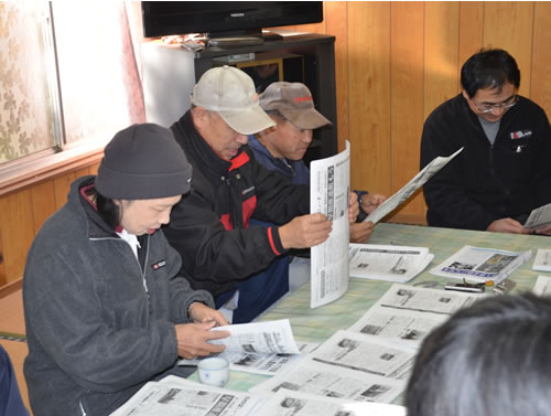 全員がニュースとカラーリーフを携えて、それぞれの担当地域に向かった。成田市、芝山町、多古町、横芝光町の各地区で第3滑走路の「説明会」開催が続いている。この状況に対応して、住民の所におもむき、説明会の実態とそこでの激しい住民の怒りの声を紹介して、反対の声を拡大する意図だ。