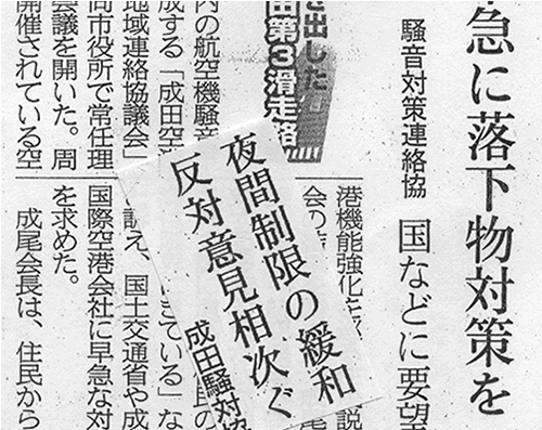 ●航空機騒音下の成田市住民で作る「成田空港騒音対策地域連絡協議会」が市役所で常任理事・監事会議を開いた。そこでは、現在説明会が行われている「空港機能強化策」への反対意見が相次いだ。成尾政美会長も「飛行制限緩和は非常識。再検討してほしい」と要望した。(19日=写真)