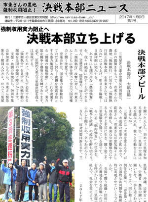 1月9日、「強制収用阻止決戦本部」の立ち上げに合わせて「決戦本部ニュース」が創刊された。A4判2ページのニュースには、表面で、天神峰看板の前での反対同盟がこぶし突き上げる写真とともに決戦本部長・太郎良陽一事務局員の「アピール」が掲載されている(別掲)。「三里塚には〝未来を変える今〟がある」との訴えは新鮮だ。