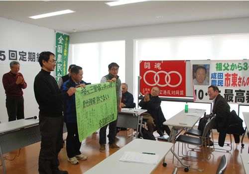 ピンスポット 全国農民会議第5回総会を開催 100人会員の実現へ 市東さんに檄布手渡す