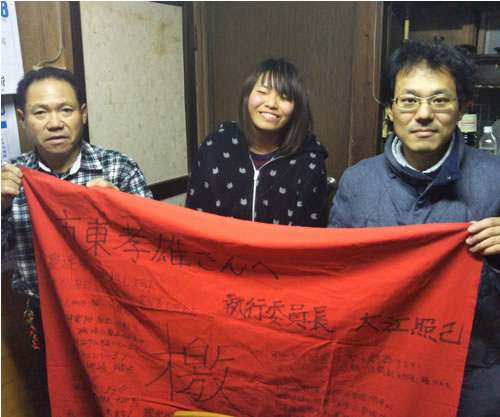 ●動労西日本の山田和広書記長が三里塚を訪れ、萩原富夫さん宅で援農を行った。夕刻、市東さん宅を訪れ「強制執行阻止」の檄布を贈った。(23日=写真)