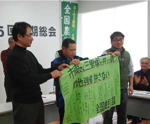 以上の特別報告を受け、総会は議案の討議採択、会計報告などのち、「市東さんの農地・作業所の強奪を許さない」特別決議を採択した。市東さんと萩原さんに岡山の内藤大一さんが檄布を渡した(写真下)。