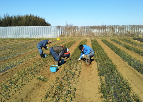 (写真 南台の畑でたまねぎの移植作業を手伝う)