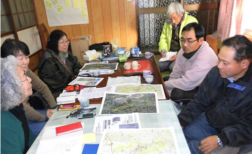現在の成田空港もコンクリートの下には、肥沃な農地や農民たちの穏やかな生活や賑わいがあったのに...。さらにもう一つ空港を造ろうとは! 空港周辺の調査のあと、市東さん宅離れの決戦本部で、農作業合い間の市東孝雄さんと萩原富夫さんにお話を伺うことができました。すぐ目の前でジェット機が飛び交う中での生活はさぞかし大変でしょうとお聞きすると、市東さんは「いや、農業は楽しいです。そうでなければとても続きませんよ」と応じ、自然を相手にした野菜作りの喜び、農地への愛着を語られました。萩原さんは、「いろんな人に共に闘おうと呼びかけていきたい」と。農地を守りたい、三里塚の運動を広げたいというお二人の熱い思いが伝わってきました。