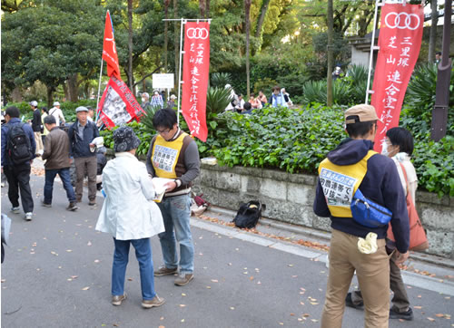 ●反対同盟と支援連は第48回周辺地域一斉行動を闘った。この日初めて市東さん農地への「強制執行阻止署名(請求異議裁判署名)」を地元住民に訴えた。(15日)